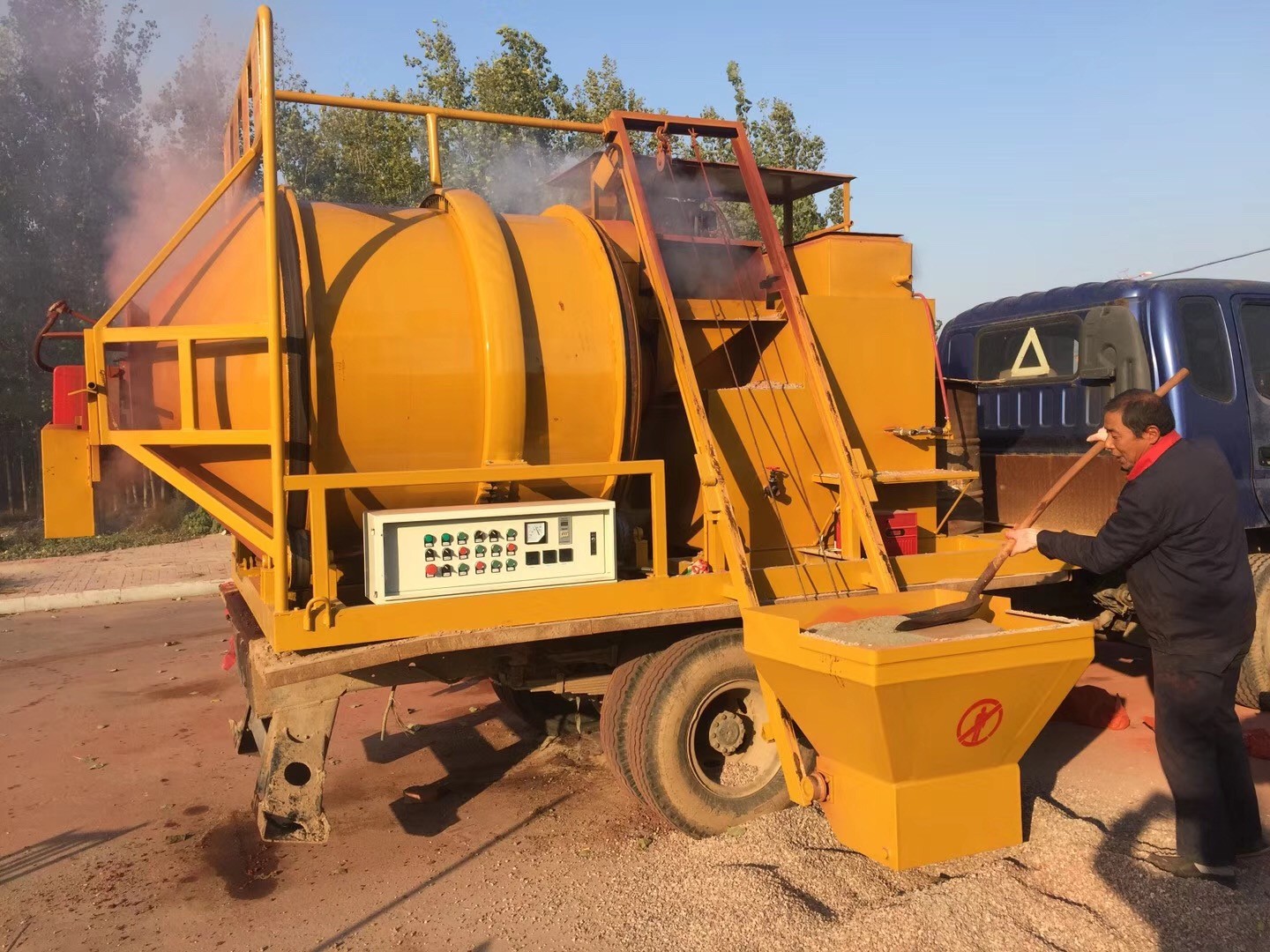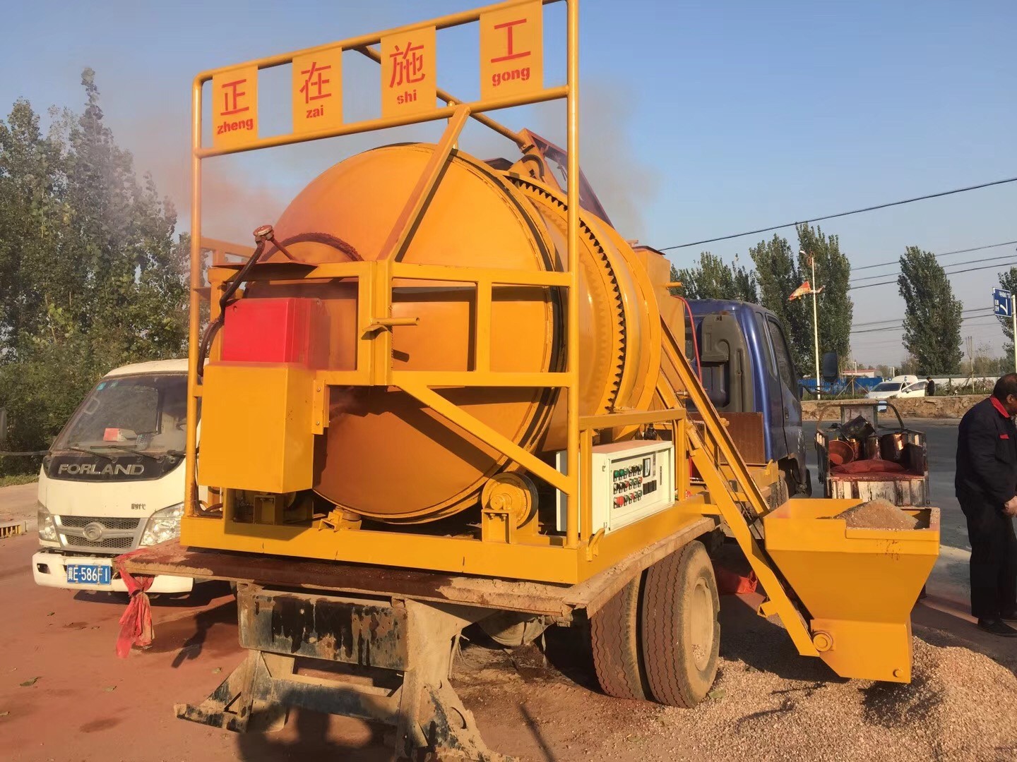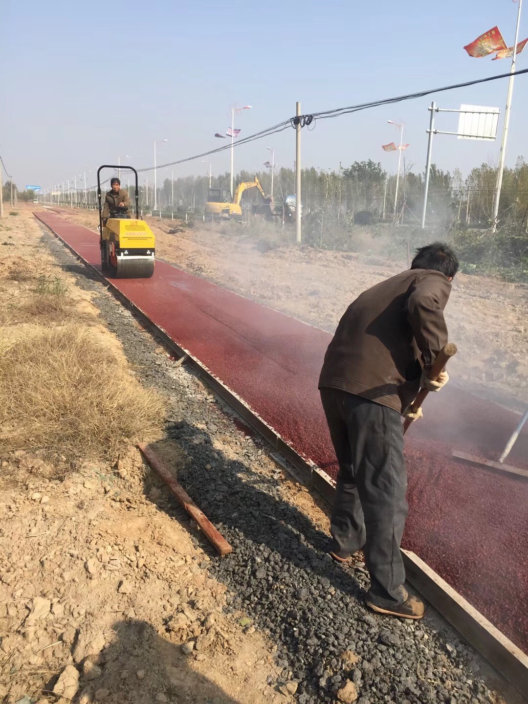 小型瀝青攪拌站生產(chǎn)各種彩色瀝青混合料,現(xiàn)場(chǎng)生產(chǎn),直接攤鋪。座駕式壓路機(jī)雙驅(qū)單振,自動(dòng)灑水,壓實(shí)效果好。
